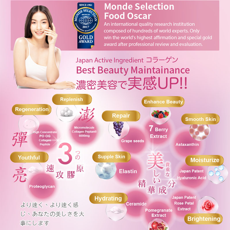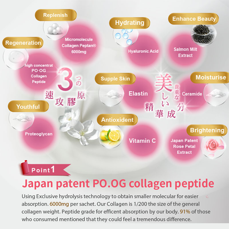 Exculsive Patent High Concentration of PO·OG Collagen. Additional Berry Extract Essence provides Antioxidant to keeps you radiant.