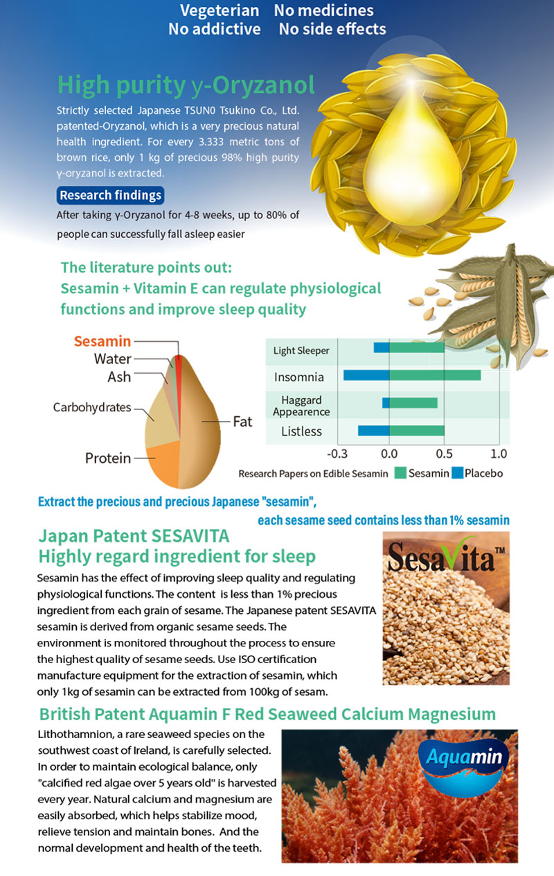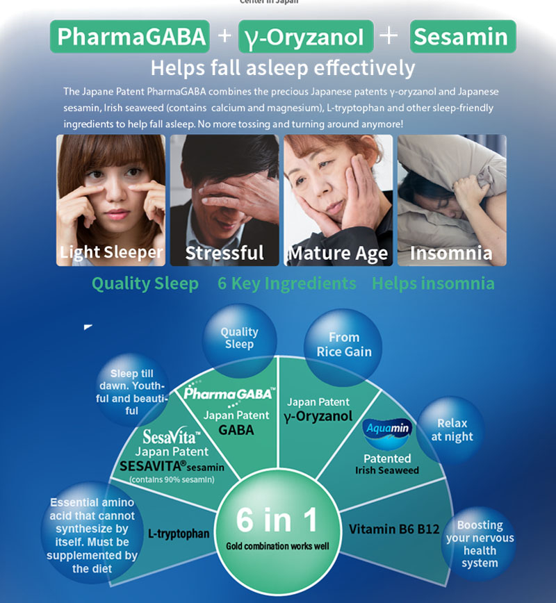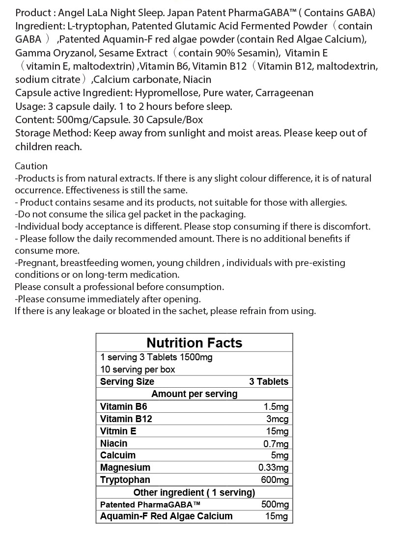 Ingredient : L-tryptophan, Patented Glutamic Acid Fermented Powder (Contains GABA) ,Patented Aquamin-F red algae powder (contain Red Algae Calcium), y-Oryzanol, Sesame Extract (Contains 90% Sesamin), Vitamin E (vitamin E, maltodextrin) ,Vitamin B6, Vitamin B12 (Vitamin B12, maltodextrin, sodium citrate), Calcium carbonate, Niacin