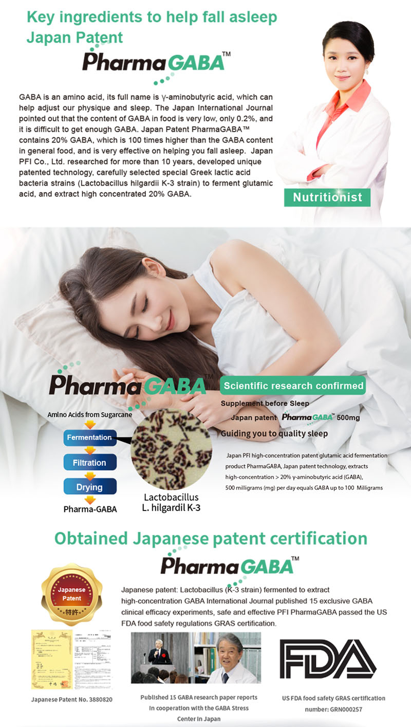 The original Japan PFI Patent PharmaGABA 500mg, combined with Japan y-oryzanol, Japan sesame extract, L-tryptophan, Irish seaweed (containing calcium and magnesium). Obtained the US FDA food safety GRAS certification. Helping you acheive full relaxation and regulate physiological functions.