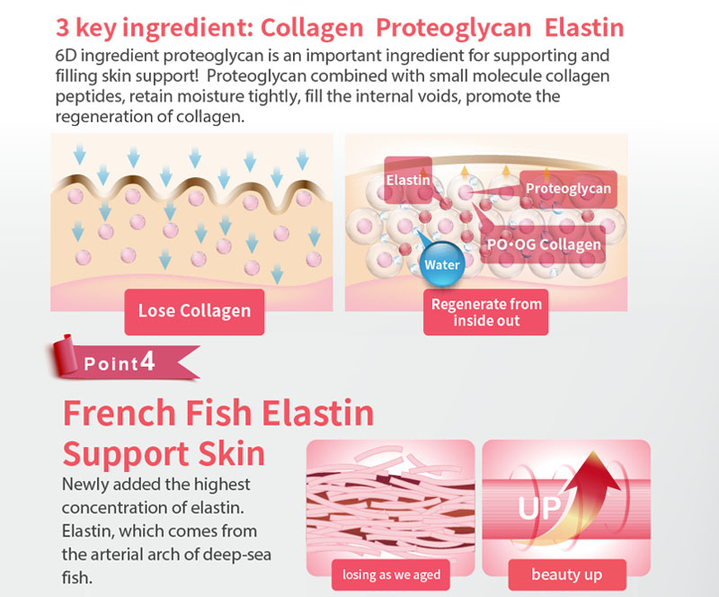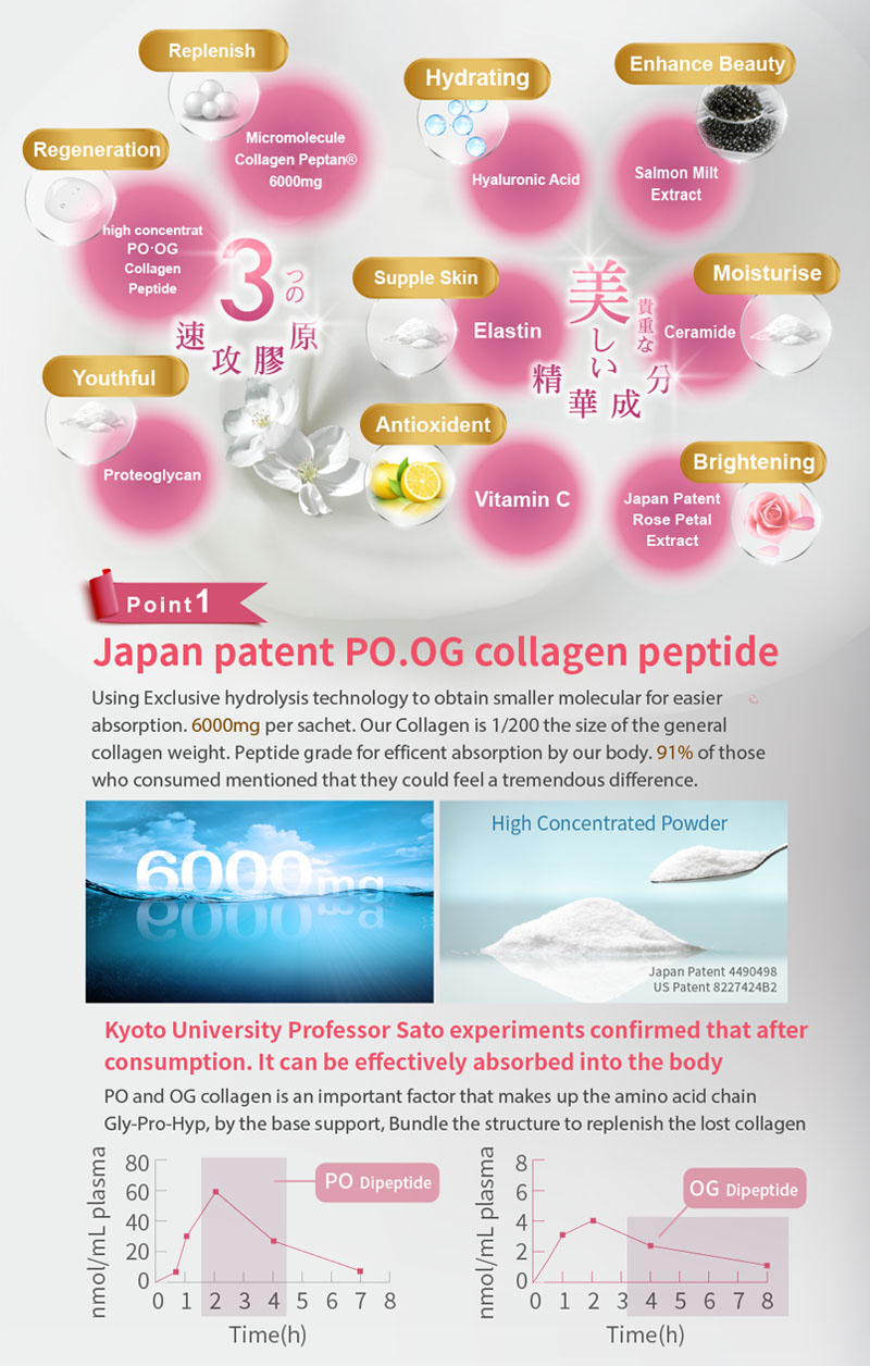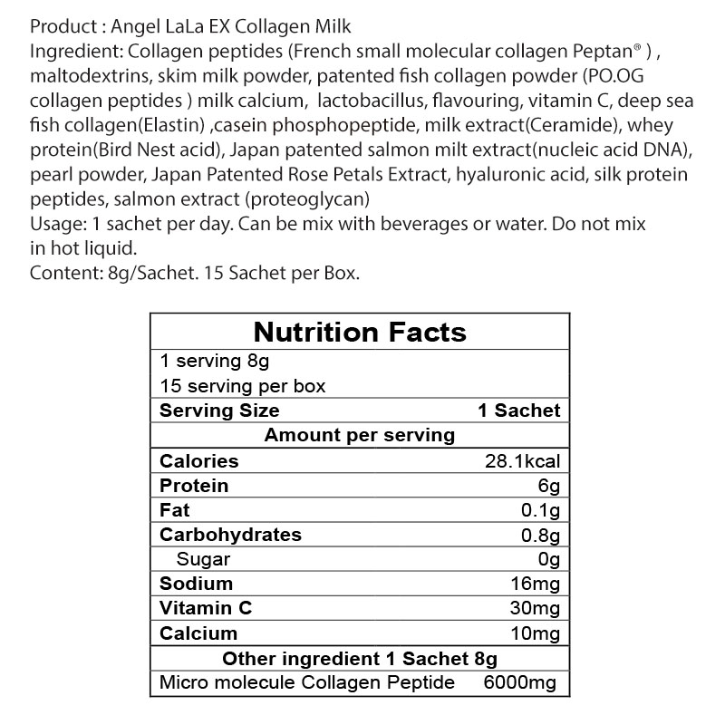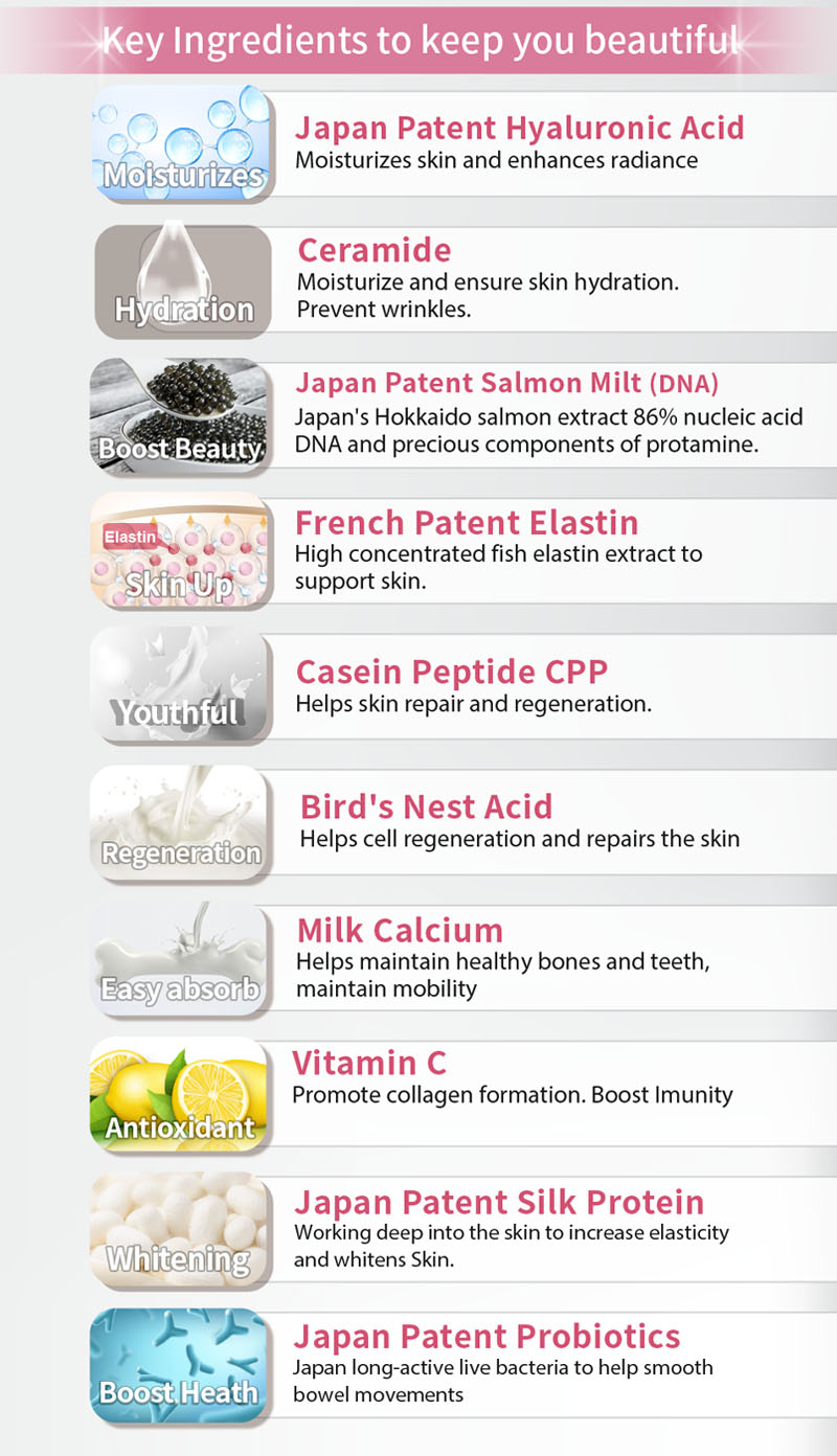 Collagen peptides (French small molecular collagen PeptanĀ® ), maltodextrins, skim milk powder, patented fish collagen powder (PO.OG collagen peptides ) milk calcium, lactobacillus, flavouring, vitamin C, deep sea fish collagen(Elastin) ,casein phosphopeptide, milk extract(Ceramide), whey protein(Bird Nest acid), Japan patented salmon milt extract(nucleic acid DNA), pearl powder, Japan Patented Rose Petals Extract, hyaluronic acid, silk protein peptides, salmon extract (proteoglycan)