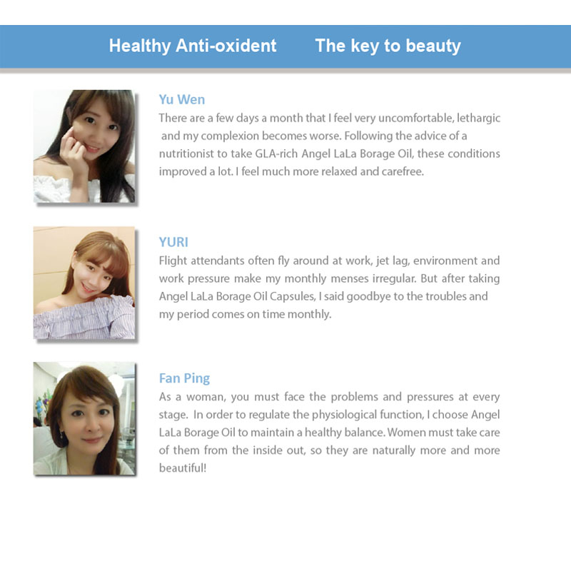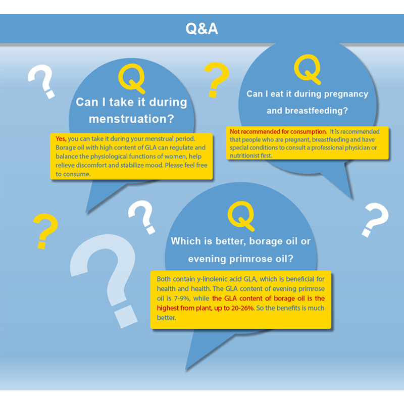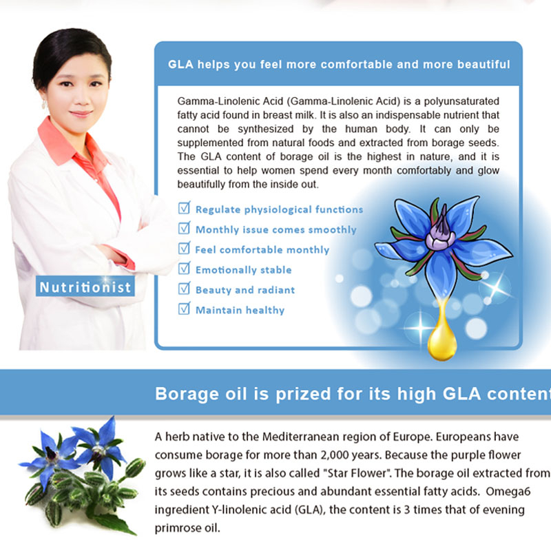 Borage oil contains the most abundant GLA naturally which is a key nutrient for regulating physiological functions, boosting metabolism and women wellness. Monthly menses will be more comfortable and relaxed every month.