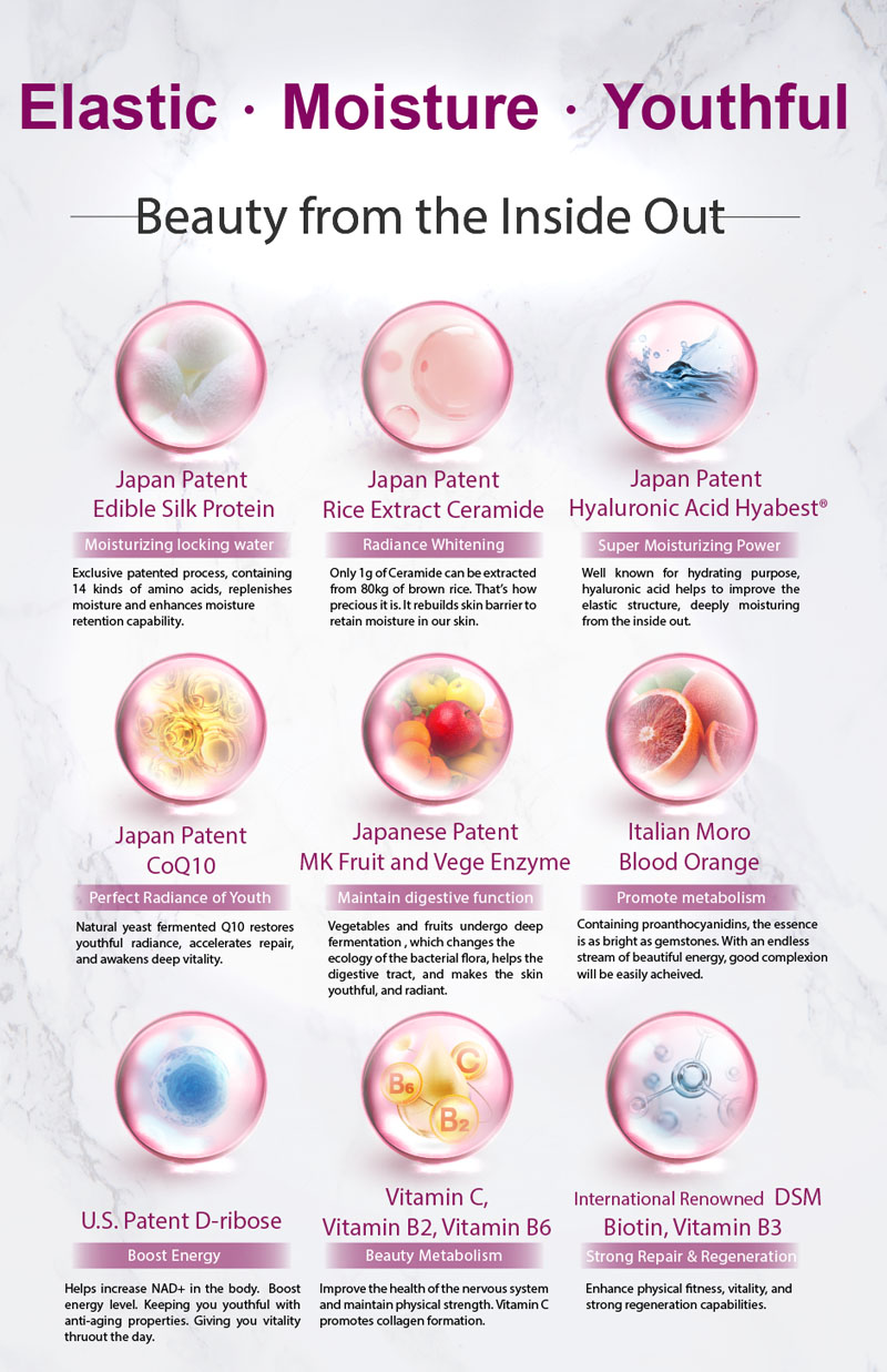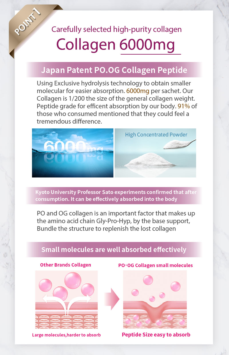 Exculsive Patent High Concentration of PO·OG Collagen. Additional Berry Extract Essence provides Antioxidant to keeps you radiant.
