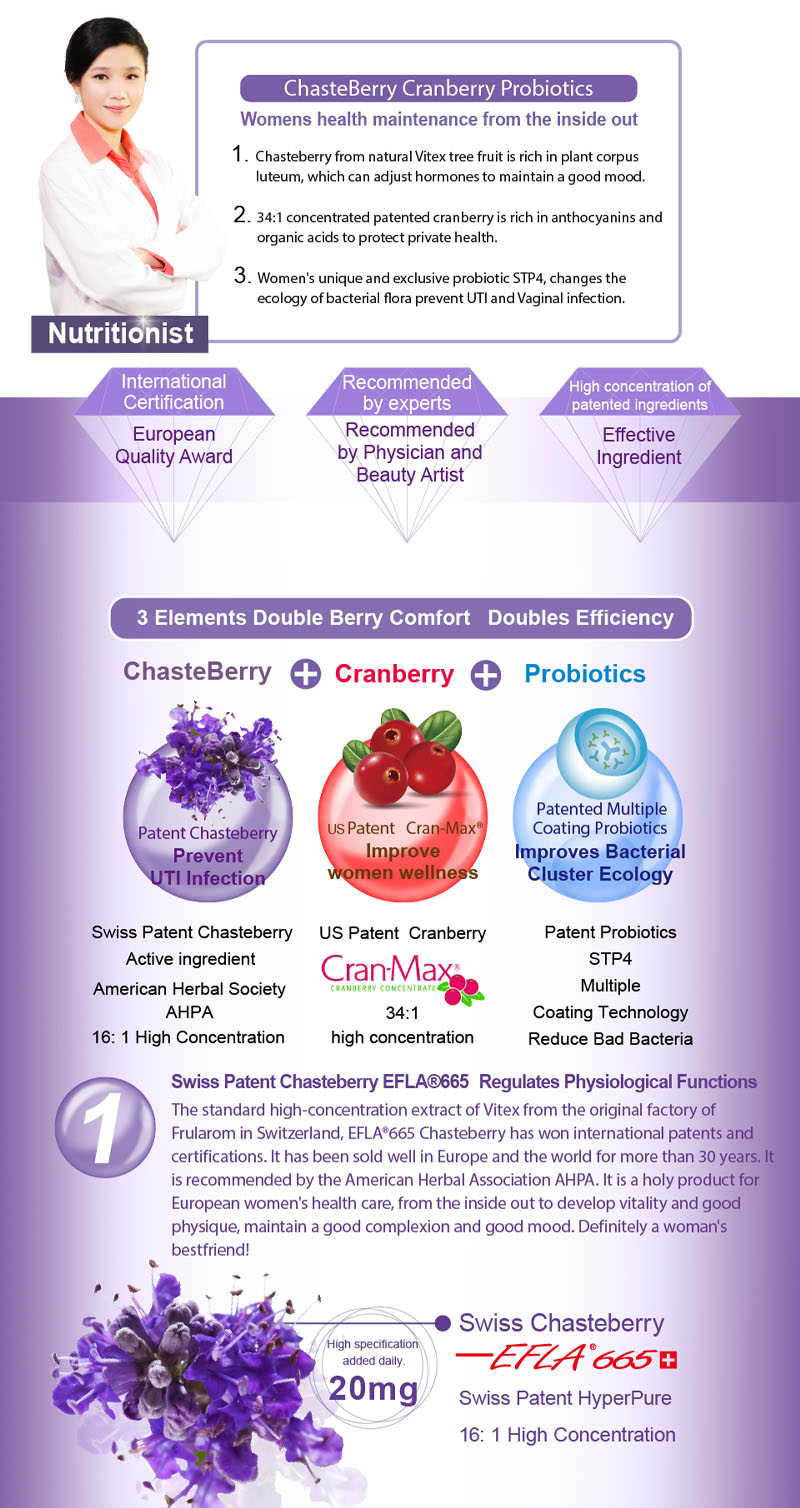 plus patented embedded STP4 six beneficial bacteria. Swiss ChasteBerry Extract, triple protection enhancement to ideal physique.