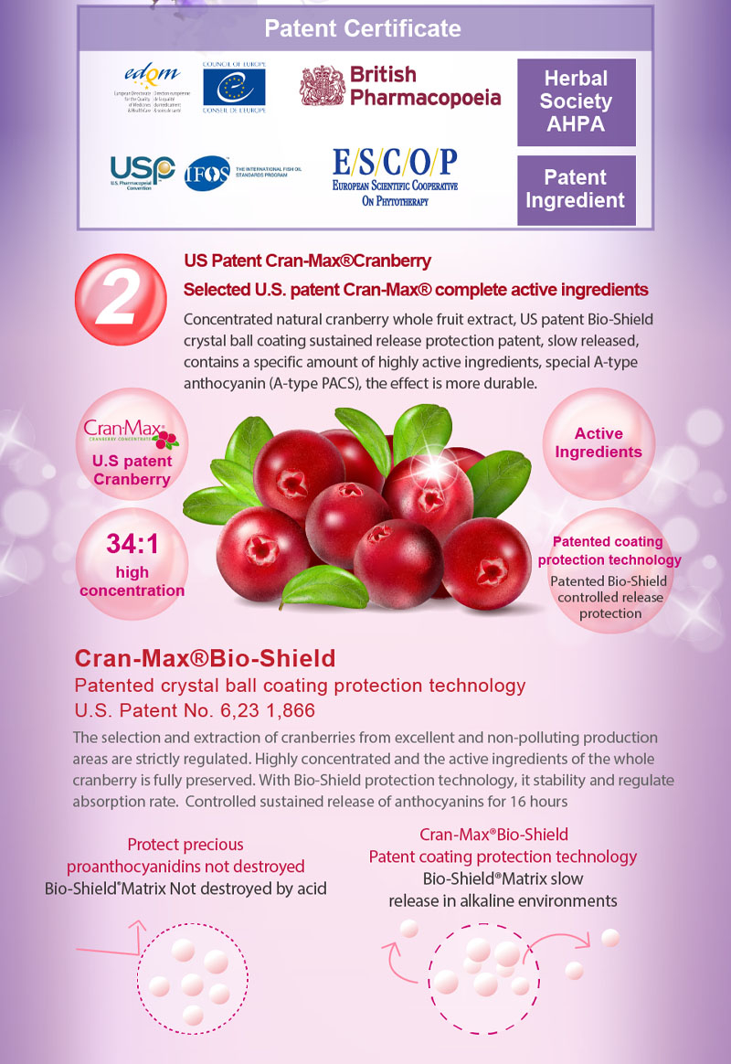✦ Concentrated natural cranberry whole fruit extract, US patent Bio-Shield crystal ball coating sustained release protection patent, slow released, contains a specific amount of highly active ingredients, special A-type anthocyanin (A-type PACS), the effect is more durable..