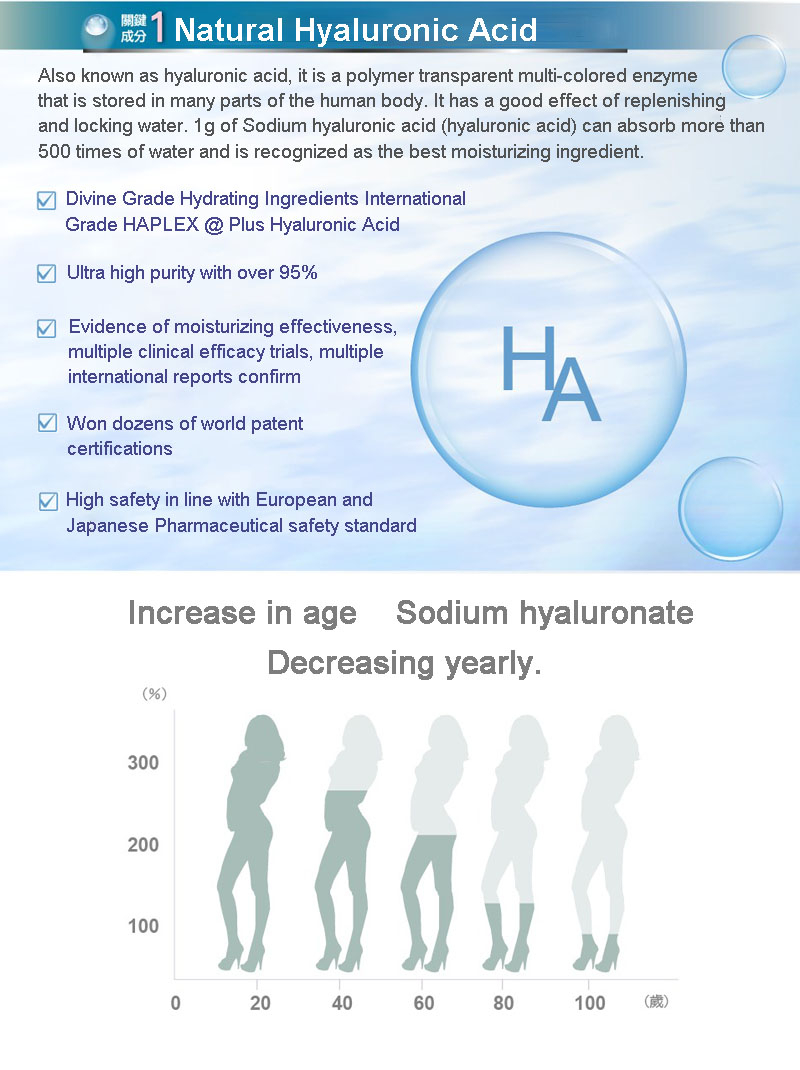 ✶Also known as hyaluronic acid, it is a polymer transparent multi-colored enzyme that is stored in many parts of the human body. It has a good effect of replenishing and locking water. 1g of Sodium hyaluronic acid (hyaluronic acid) can absorb more than 500 times of water and is recognized as the best moisturizing ingredient.
