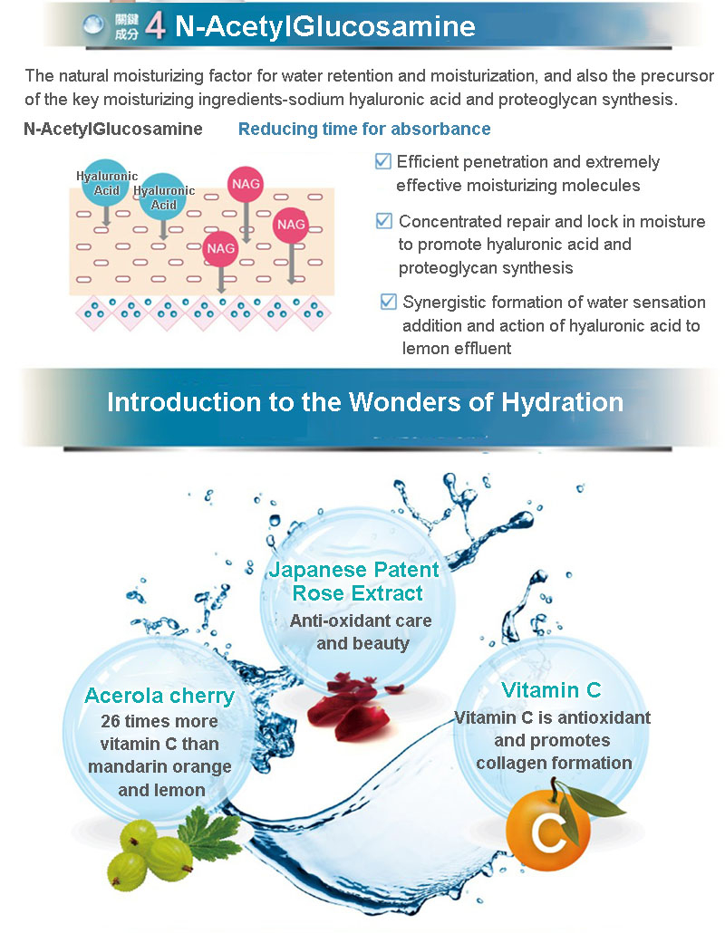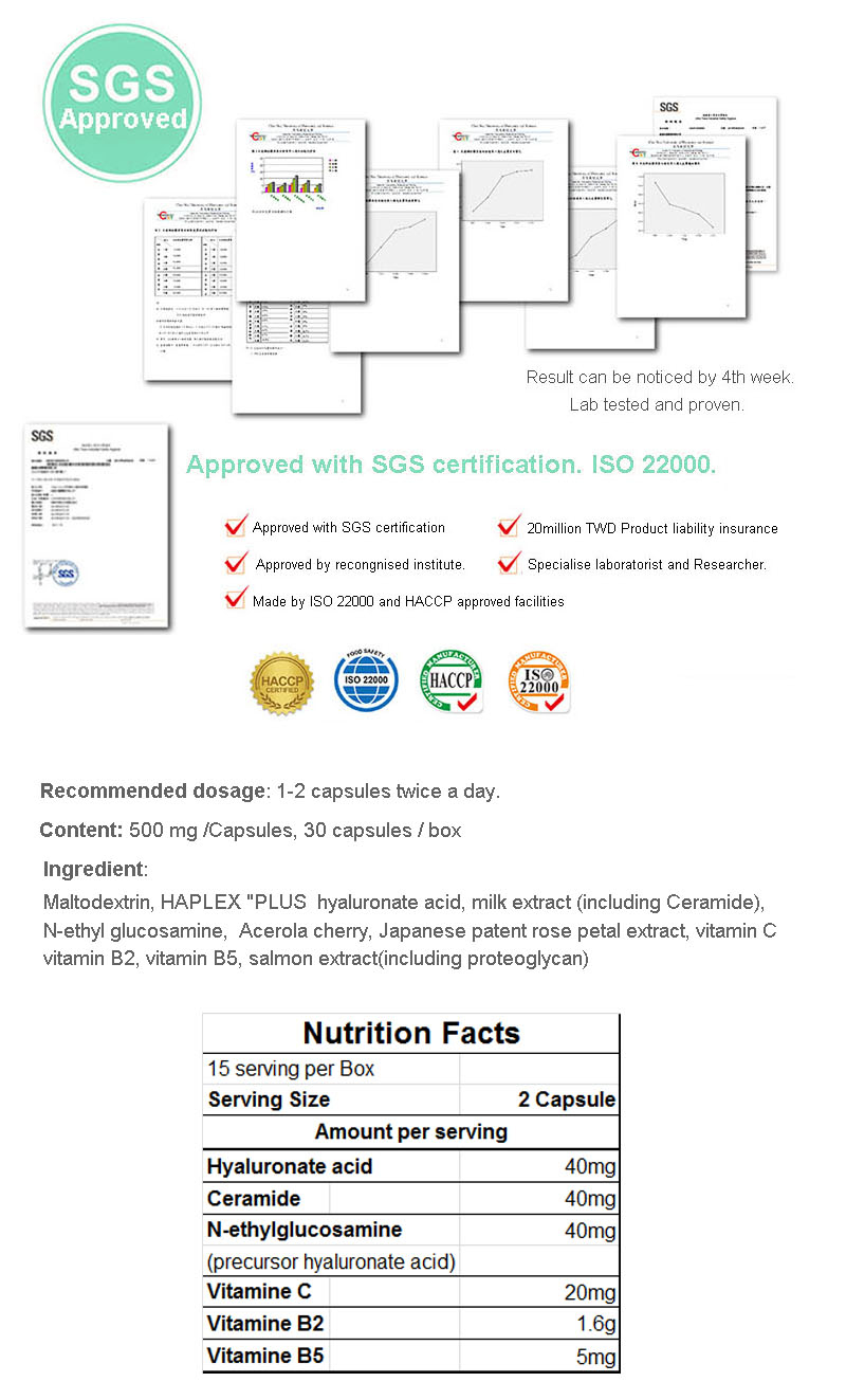 Ingredient: Maltodextrin, HAPLEX®PLUS hyaluronate acid, milk extract (including Ceramide),N-ethyl glucosamine, Acerola cherry, Japanese patent rose petal extract, vitamin C vitamin B2, vitamin B5, salmon nasal cartilage extract