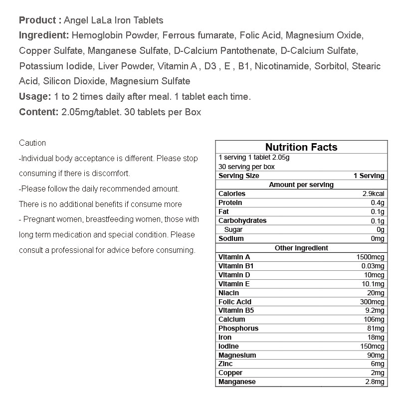 Taiwan No.1 Angel LaLa Iron Tablets. Helps anemia. Reduce Fatigue. Heme/Folic acid/Boost Immunity