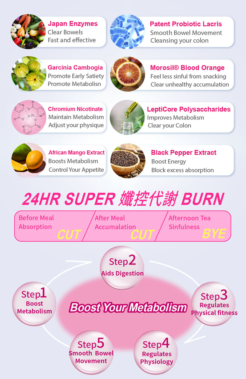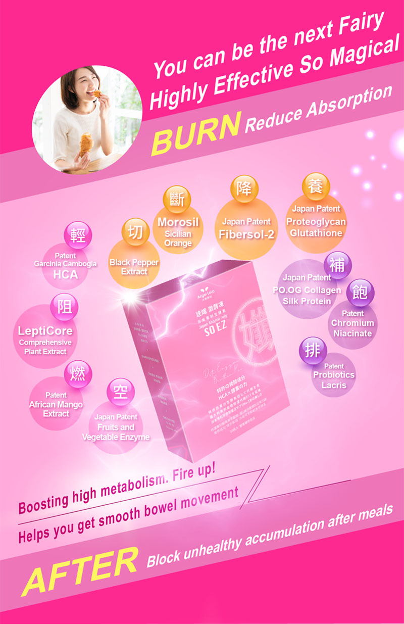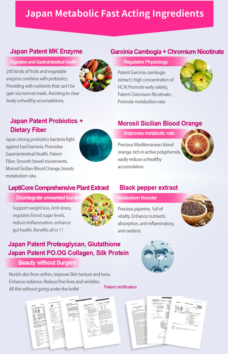 Contains Japan Patent Fruits and Vegetable Enzymes, combined with High-Concentration Patent African Mango Extract, Patent Garcinia cambogia, Morosil® Sicilian blood orange, LeptiCore Patent Plant-based Polysaccharides ,PO.OG Collagen , Patent Probiotic Lacris.